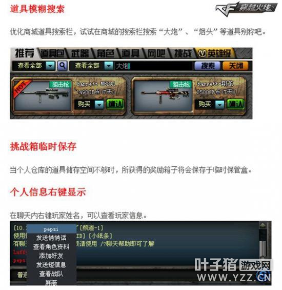 ![]() 多种优化并进CF改善用户游戏体验 除隆重开启的“GP抽奖”外,新版本“A计划”还有不少其他优化。例如:道具商城的模糊搜索,游戏中很多的道具,玩家们都不知道它的全名拼写,反而是对“俗称”比较了解,模糊搜索的推出意味着你输入“大炮”、“烟头”等名称后也能在商城找到“正主”;挑战箱临时保存功能可以将所获得的奖励箱子保存于临时保管盒,避免因为玩家个人仓库的道具储存空间不够而遭受损失;个人信息右键显示的功能方便玩家查看聊天对象的详细信息,让游戏交友更加容易和快捷。以上的几个细节方面的优化,或许不如“GP抽奖”那样受人关注和意义重大,但对于用户游戏体验的改善确实实实在在。