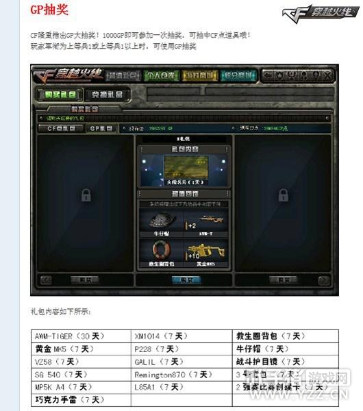 ![]() “GP抽奖”隆重开启游戏币换取收费道具 “GP”是CF游戏币的简称,玩家通过日常游戏就可不断获取,可以用来购买GP点的枪支和道具。但随着游戏运营时间的增长,越来越多的老玩家们GP不断的增多,却没有了花销的地方。在游戏内早有“标识”,但却一直未开启的“GP”抽奖就成了CFer们共同的期待。在近期曝光的12月新版本“A计划”中,玩家们期待已久的“GP抽奖”就要开启,据悉,军衔为“上等兵1”和“上等兵1”以上的玩家花费1000GP即可参加一次抽奖,奖励列表包括AWM-T1GER狙击枪、黄金MK5冲锋枪、巧克力手雷、GALIL步枪、牛仔帽在内的众多绝版或CF点道具。从此开启游戏币(GP)换取收费道具(CF点)的大门,让广大玩家更好的享受游戏精彩。