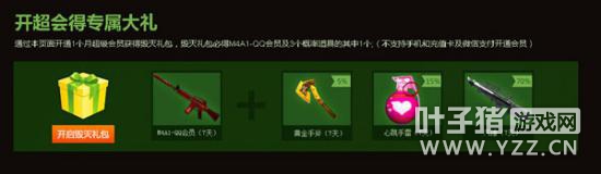 开超会得专属大礼 通过本页面开通1个月超级会员获得毁灭礼包,毁灭礼包必得M4A1-QQ会员及3个概率道具的其中1个;(不支持手机和充值卡及微信支付开通会员)