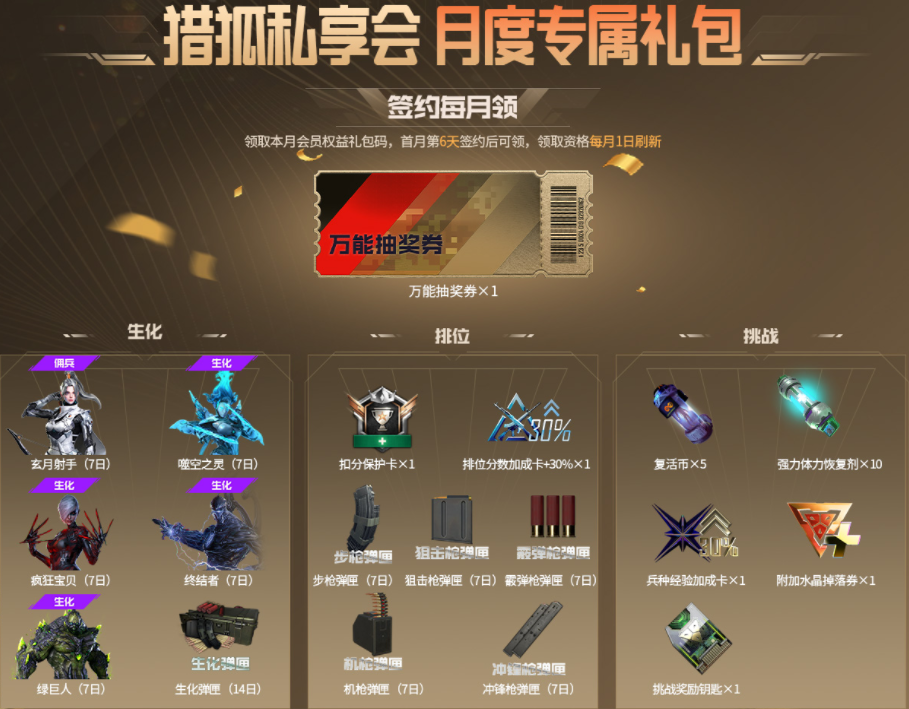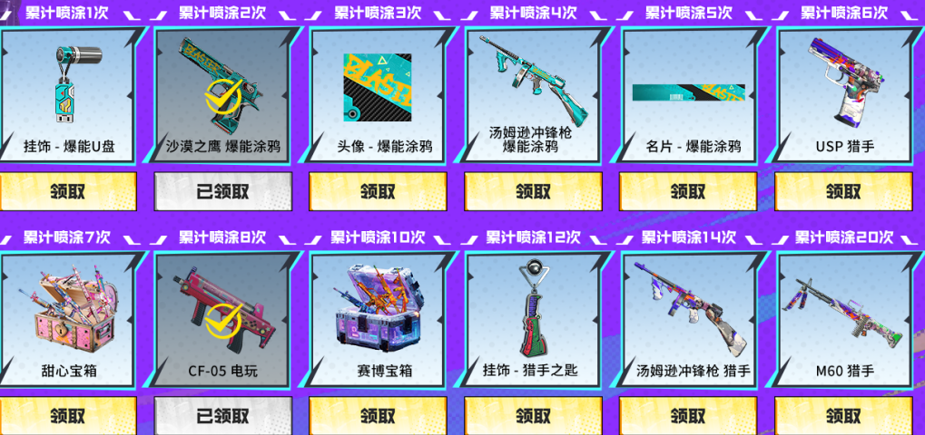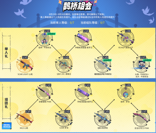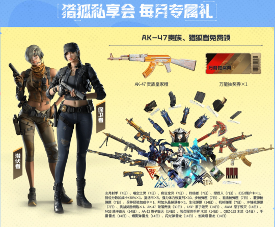 爆能涂鸦活动现已开启,参与领取海量奖励,还有猎狐者的约定活动上新,签约即可免费领取M4A1 贵族皇家橙。 爆能涂鸦领奖励 9月1日-9月30日期间,CFer完成登录、对局任务即可完成一次喷涂,每日邀请好友登录还能完成荧光喷涂。 完成对应喷涂次数就能领取奖励,最多可喷涂20次带走12重奖励! 另外完成4次荧光喷涂还能将四重豪华奖励直接带回家,不可错过。 火线周末送好礼 火线周末即将火热开启,CFer只需在9月内的每个周末完成登录+对局任务即可领取皮肤、名片以及生化道具等豪华奖励,每周完成全部任务还能解锁最终大奖。 完成4周任务还可领取万能抽奖券、尼泊尔军刀 炸鸡以及匕首 清刚,赶紧参与吧! 七夕活动开启中 CFer也不要忘记参与七夕活动,9月16日前登录即可领取全新首发超声波战刃 牛郎织女,25日前累计三周游戏即可永久保留。 另外在9月16日前还可积极参与鹊桥相会组团活动,完成任务提升个人及团队等级领取超多好礼。 蝴蝶灵猫抵扣券 CFer现在登录活动页面还能领取全新传奇蝴蝶与灵猫100积分抵扣券,机不可失。 猎狐私享会更新 9月猎狐私享会已经更新,CFer每日游戏一局,一个自然月内完成6天即可完成首次签约并且领取猎狐者,下个自然月任意一局游戏视为续约成功。 M4A1 贵族皇家橙 领取过猎狐者的CFer连续3月任意游戏1天即可永久领取M4A1 贵族皇家橙。 对局领贵族皇家橙 CFer首次签约前完成6天对局任务,还可领取AK-103 吸血鬼 猎狐、尼泊尔军刀 贵族皇家橙(7日)、AK-47 贵族皇家橙(14日)等奖励。 月度专属礼包 签约用户每月还能领取猎狐私享会会员礼包,万能抽签券以及生化、排位、挑战模式超多道具等你来领。 猎狐专属兑换区 CFer成功签约后,每月1日都可在专属兑换区内任选两件领取。 9月豪华福利已就位,CFer赶紧上线解锁福利参与活动,不要错过! |