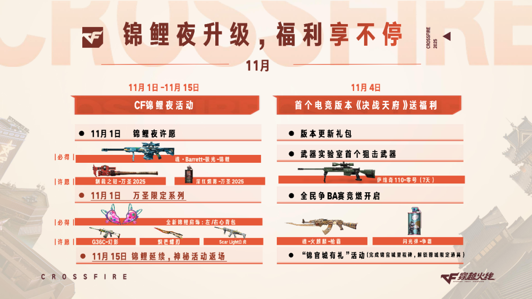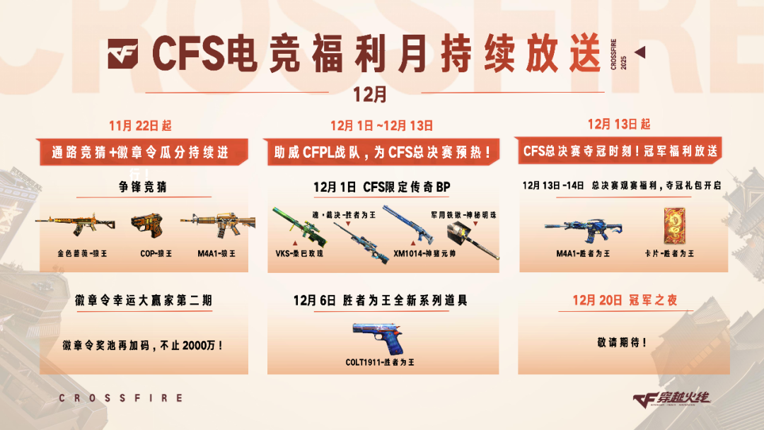 | 穿越火线新版本《决战天府》将于11月4日正式上线,本期本狐将为各位带来即将上线的模拟CFS国际比赛的全新模式——CFS模式的爆料,一起来看看吧~ CFS模式是模拟CFS国际比赛的绝对公平的裸装爆破模式,在武器、角色、地图池、加时赛和人数设定等规则上与CFS比赛大部分一致。CFer们可以在该模式中,体验CFS赛场上的对局氛围。 CFer在新旧大厅进入该模式时,将使用CFS模式专属配置,具体内容可在个人仓库中进行自由搭配。 个人仓库中,CFer可以切换至“CFS比赛模式仓库”。 (CFS专属仓库入口) 仓库中有为全体CFer发放的全套CFS武器,CFer可以自行配置“CFS比赛模式专属背包”,无论是喜欢使用哪种武器的CFer,都可以自由挑选自己喜欢的武器。 (CFS专属仓库) CFS模式的地图池由:潜艇-CFS、港口-CFS、黑色城镇-CFS、卫星基地-竞技荣耀、异域小城-CFS、新鹰眼-CFPL 十周年纪念版以及新沙丘共7张地图构成。 CFS模式启用对局人数5 VS 5的先胜6局制,当双方比分5:5时触发加时赛,6:6时触发黄金加时赛,拿到7分则获得胜利。 CFS全民争BA赛火热开启中,10月26日开启预热,CFer上线游戏一局即可一键领取CFS练枪大礼包。CFS模式专属武器轻松领。 进入11月后,围绕电竞和CFS将上线多个丰厚福利活动。争BA赛、争锋竞猜、徽章令活动第二期、CFS观赛助威活动将接踵而至,狐狐已将活动日历整理好,大家可以收藏一下,避免错过。 各位CFer想必已经迫不及待体验充满竞技乐趣的新模式了,上线后记得叫上战友一起体验~我们下期再见! |