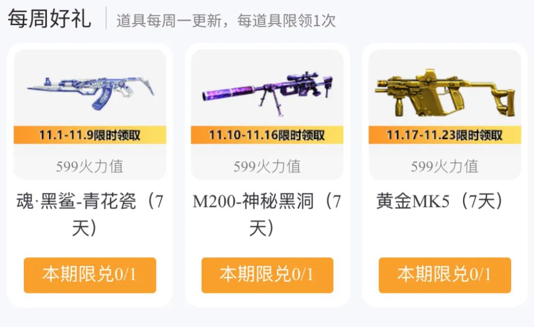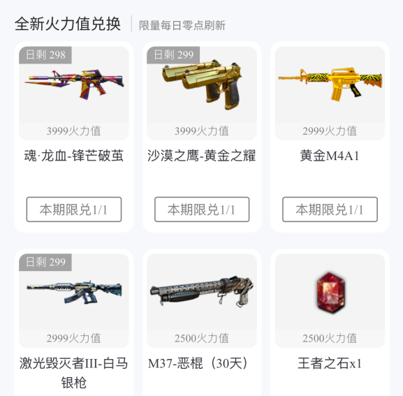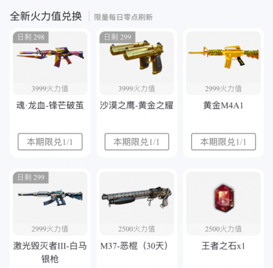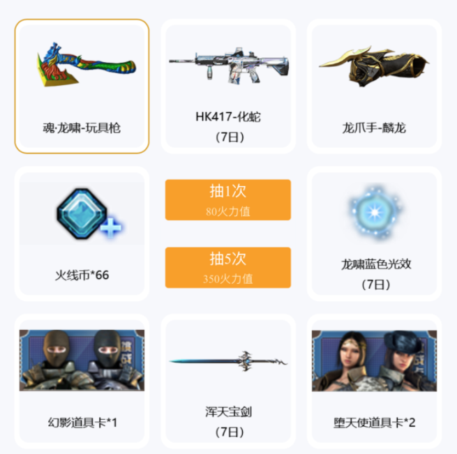 | 11月火力值活动奖励更新。本月积分兑换奖池上架魂·龙血-锋芒破茧、沙漠之鹰-黄金之耀、激光毁灭者Ⅲ-白马银枪等丰厚的奖励道具,参与火力值签到还可免费领取挑战神器深渊巨龙咆哮Ⅰ,此外参与火力值抽奖更有机会获得魂·龙啸-玩具枪、龙爪手-麟龙等精品道具。 在活动介绍前需要告知各位CFer,10月31日将清空现有火力值,并陆续转为积分(1火力值=1积分) ,在 11月1日开始累计新的火力值! 活动时间:11.01-11.30 核心道具奖励:魂·龙血-锋芒破茧、沙漠之鹰-黄金之耀、激光毁灭者Ⅲ-白马银枪、黄金M4A1、王者之石*1 其它道具奖励:觉醒宝石x10、M37-恶棍(30天)、属性变更券x10、凤凰之魄(30天)、VEPR-12-金魔(7天)、冰火护目镜(7天)、复仇道具卡(2张)、柯尔特-涂鸦(7天)、凤凰之火(30天)、雷霆道具卡x1 参与方式:CFer通过每日签到和完成火力值任务积累火力值,达到对应的火力值要求即可消耗火力值兑换道具。 活动时间:11.01-11.30 核心道具奖励:巨龙咆哮Ⅰ 其它道具奖励:M16-S(30天)、幻影道具卡(5张)、丰厚的火线币 参与方式:CFer通过每日签到即可领取火线币奖励,达到指定天数华友加码好礼可领,累计签到16天即可领取非期限版巨龙咆哮Ⅰ。 活动时间:11.01-11.30 核心道具奖励:魂·龙啸-玩具枪、龙爪手-麟龙 其它道具奖励:HK417-化蛇(7天)、龙啸蓝色光效(7天)、堕天使道具卡(2张)、浑天宝剑(7天)、幻影道具卡(1张)、火线币*66 参与方式:CFer可以选择消耗80火力值进行单次抽奖或消耗350火力值进行5连抽,参与抽奖将有概率获得上述奖励。 活动时间:11.01-11.30 核心道具奖励:魂·黑鲨-青花瓷(7天)、M200-神秘黑洞(7天)、黄金MK5(7天) 参与方式:CFer每周进入周礼包页面消耗599火力值即可购买专属礼包,获得对应的期限奖励武器,并且礼包道具每周刷新,周周不同。 超多精品道具加入11月火力值活动,完成任务即可领取海量加码福利!各位CFer快来参与吧! |
