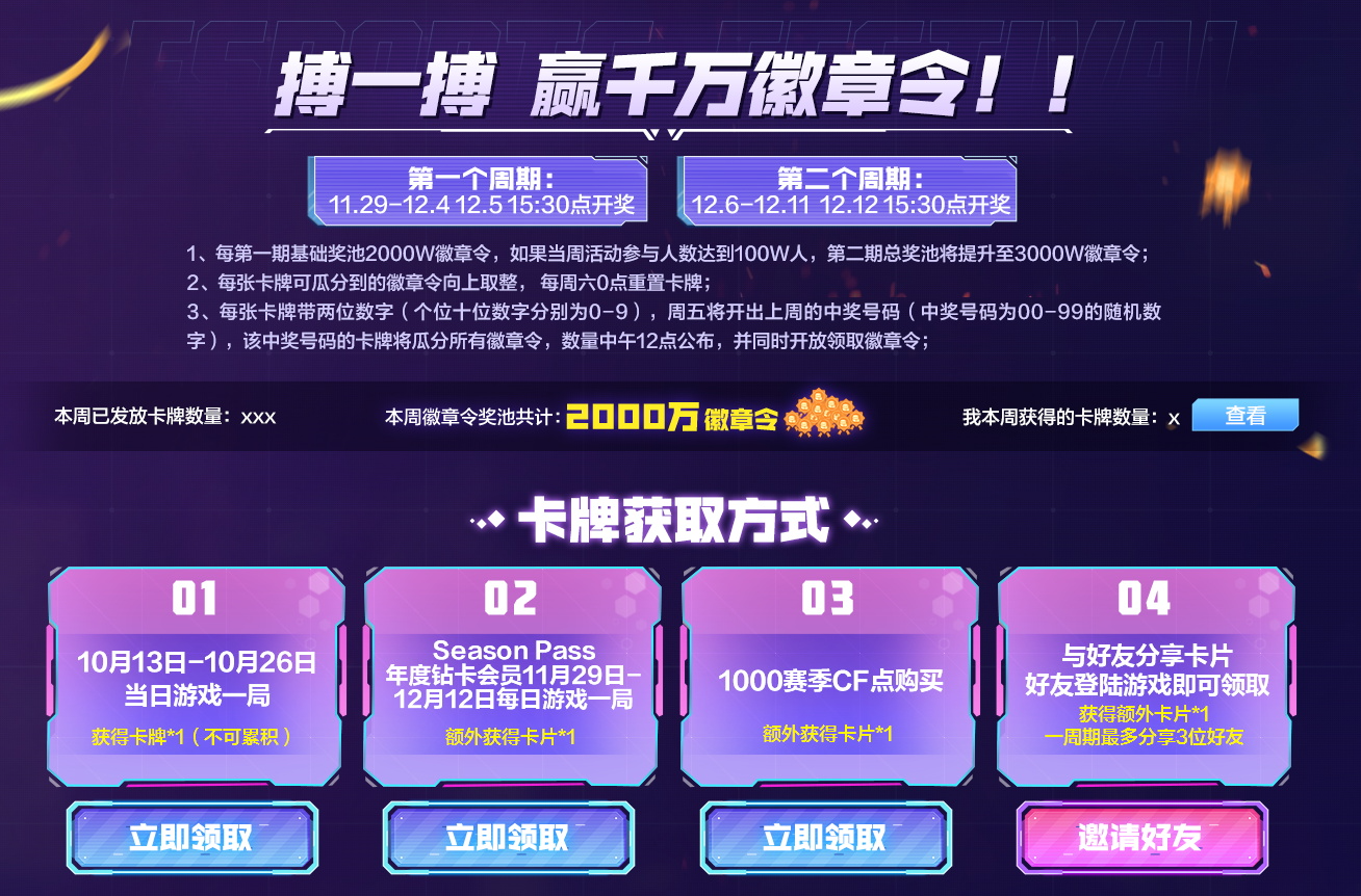 11月29日起,连续两周,CFer参与活动获取卡牌即有机会参与瓜分超千万徽章令奖池,更有保底徽章令每天登录轻松拿。幻神-AG-CFPLS17冠军、炽芒蝶刃-巅峰荣耀 皮肤、毁灭-巅峰荣耀 皮肤、白虎-AG-CFPLS20冠军等超多奖励等你来兑换! 双周期奖池 海量徽章令等您瓜分! 活动时间:第一周期:11.29-12.5 第二周期:12.6-12.12 核心道具奖励:徽章令 参与方法:CFer每日游戏1局得1张卡牌和一定数量的徽章令,并且SeasonPass会员每日游戏可额外获得1张卡牌。 除了通过游戏获取,CFer消耗1000赛季CF点还可购买1张,分享卡片给好友,好友登录即可领取并再获得1张(每周期限3位好友)。 每张卡牌自带两位数数字,当周五15:30(第一期为12.5)开出上周中奖号码(00-99随机),对应卡牌数字的玩家即可瓜分当期徽章令奖池。 见好就收,徽章令新增兑换 核心道具奖励:2025最强步枪-N9名片+喷涂、CFPL S24 FMVP名片+喷涂、高爆手雷-SS(7天)、粉色枪口火焰(7天) 参与方法:CFer可直接使用徽章令兑换此处的道具。 无需复杂操作即有机会瓜分2000W徽章令的丰厚奖池,还有每日登录保底福利加持!超多赛事主题装备加入徽章令兑换奖池,快来参与吧! |