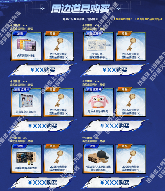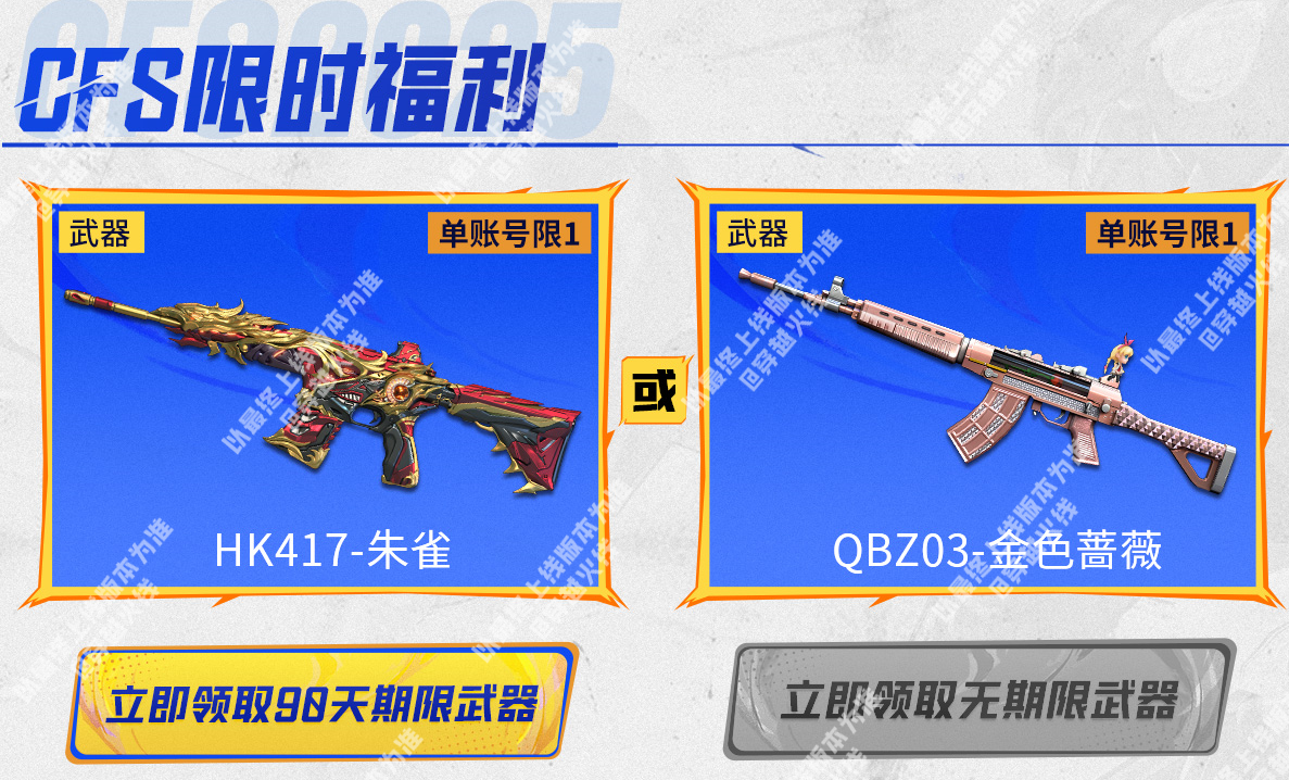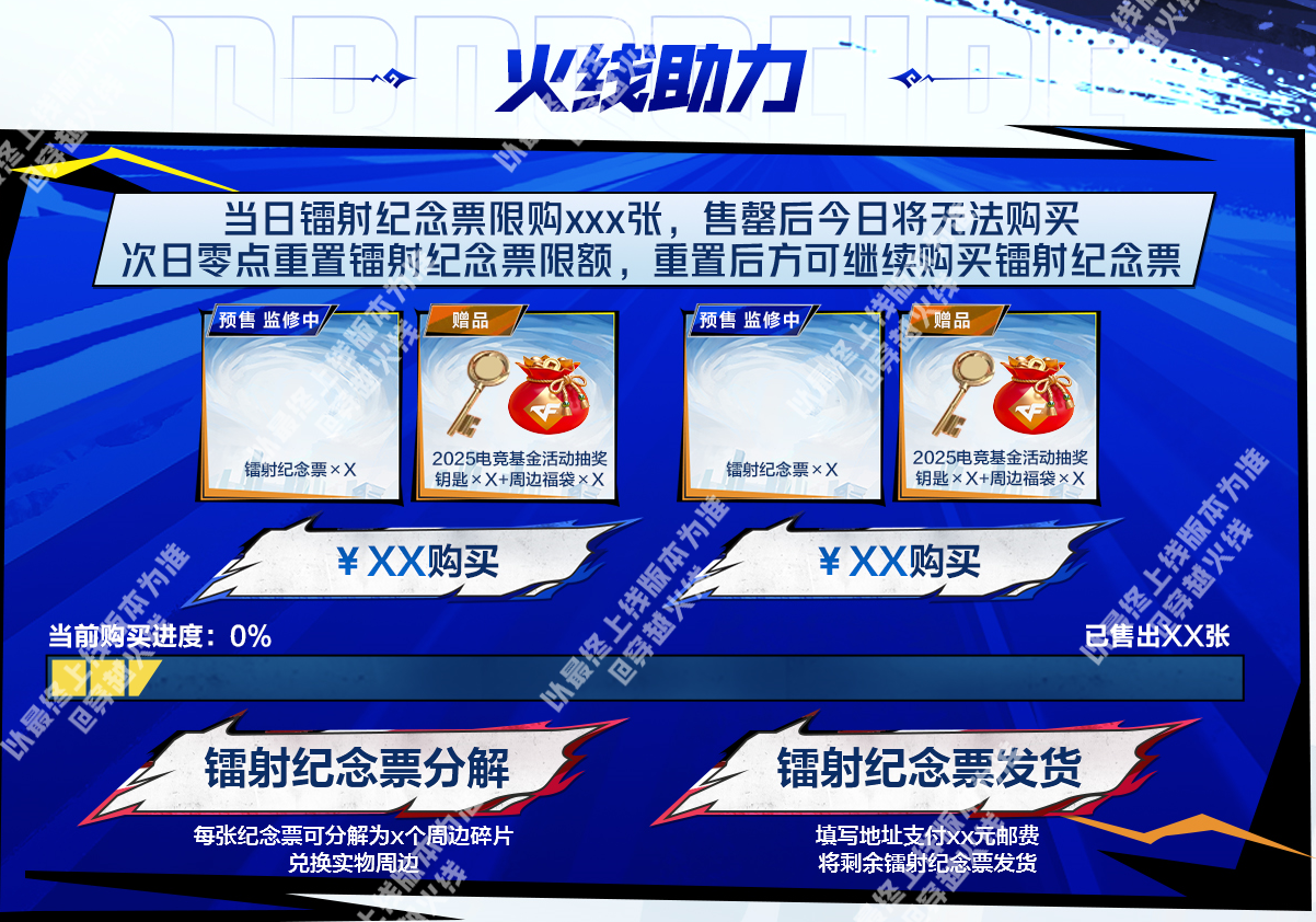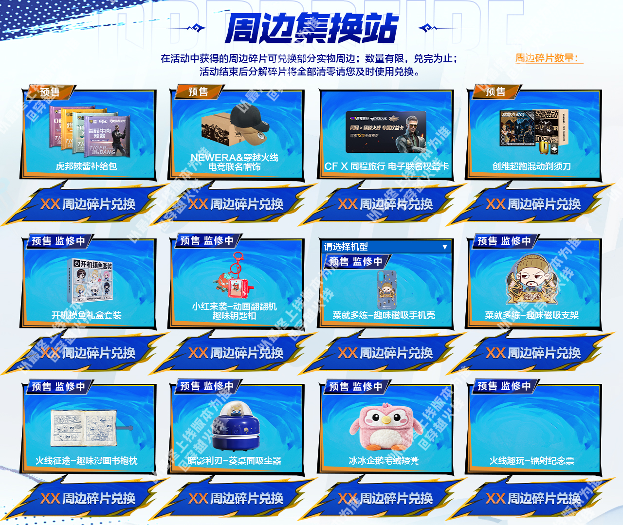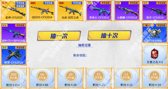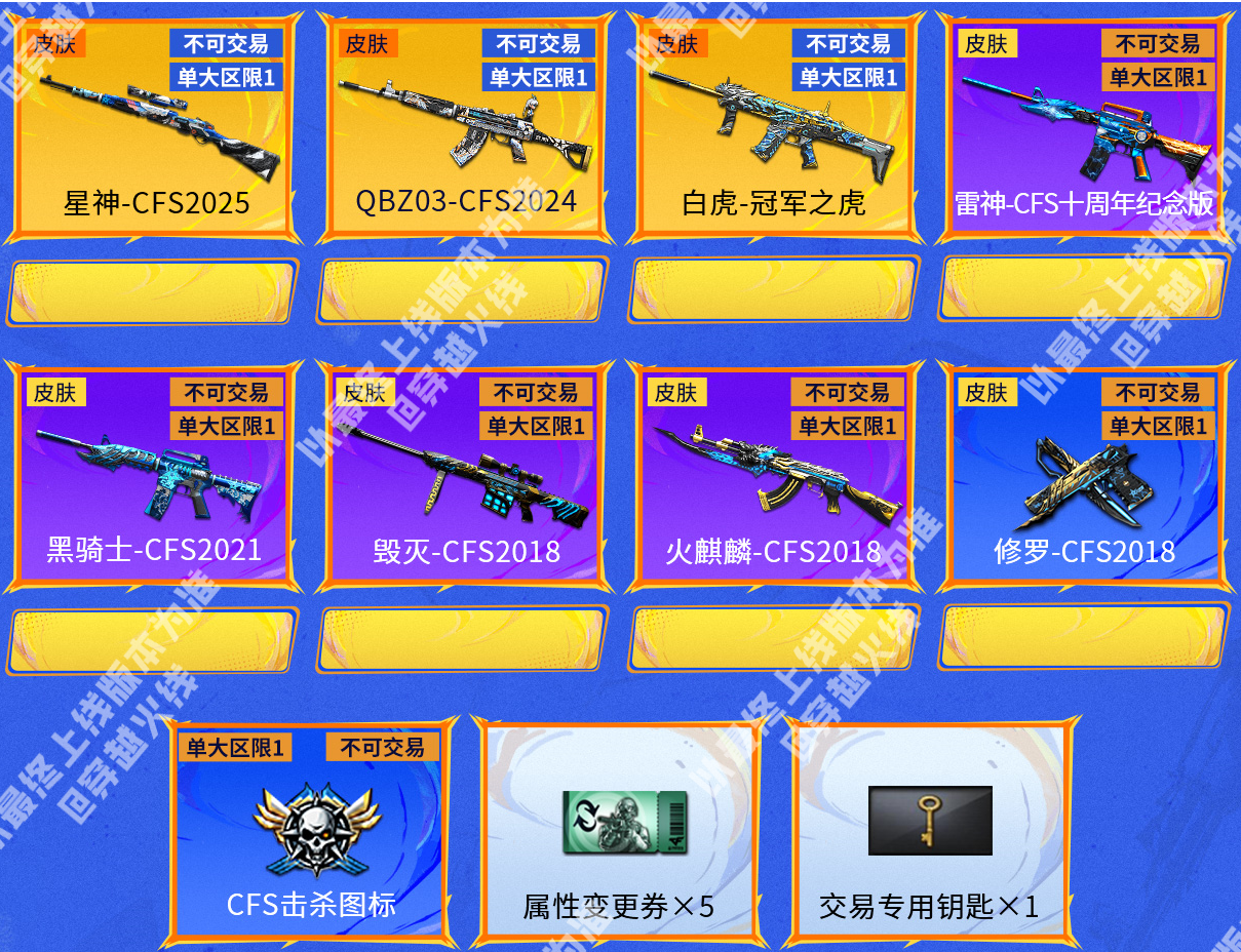 全新VVIP皮肤 星神-CFS2025即将在2025CFS电竞基金活动迎来首发,同时参与周边活动还可提前获取活动抽奖钥匙,另外2025CFS世界总决赛也已经开启售票,跟着一起看看吧! 活动奖励 CFS电竞抽奖奖池 本次活动主奖池不仅首发了星神-CFS2025 皮肤,并且还迎来了QBZ03-CFS2024皮肤、Scarlight-白虎-冠军之虎 皮肤、黑骑士-CFS2021、雷神-CFS十周年纪念版 皮肤、CFS击杀图标等稀有道具。当CFer在奖池中获取到可分解的道具时,可前往暂存箱选择分解为积分或直接发往游戏仓库。 积分兑换奖励 CFer可使用积分兑换奖池内奖励,同时还有属性变更券以及交易专用钥匙可供兑换。 活动规则 万能碎片兑换区 2025万能碎片有效期至2025.12.31 23:59:59。 持有2025万能碎片的CFer可在活动页面兑换游戏内宝石以及本活动抽奖钥匙,记得不要错过啦~ CFS限时福利 在2025CFS电竞基金活动中,CFer单大区抽奖满一定次数即可领取HK417-朱雀(90天),或QBZ03-金色蔷薇(90天),领取资格单账号总限1次。 已经领取90天武器的账号在指定日期道聚城穿越活动专区任意完成一次付费即可在本模块立即领取对应的无限期武器。 周边活动 参与火线摸鱼趣味站活动即可购买CF周边道具,还能抢先获取2025电竞基金活动抽奖钥匙。 周边道具购买 CFer购买指定周边道具,即可获取对应数量的2025电竞基金活动抽奖钥匙,可用于抽取2025CFS电竞基金活动奖池。 火线助力 CFer购买镭射纪念票也可获得2025电竞基金活动抽奖钥匙以及周边福袋作为赠品,镭射纪念票可选择分解为周边碎片来兑换实物周边,或选择支付邮费发货。(填写地址支付邮费并点击“镭射纪念票发货”后,会将目前账号剩余镭射纪念票一同发出) PS:每日镭射纪念票拥有总限购数量,售罄后当日无法继续购买,需等待次日零点重置限额后方可继续购买。 道聚城福利 CFer可选择在本活动页面开通超值道聚城省钱卡,省钱卡用户在购买活动产品时可额外获赠指定数量的周边福袋,同时享有多项省钱卡专属权益。 PS:该权益在活动期间单账号限1次;仅开通省钱卡不会获得赠品。 周边福袋 CFer获取周边福袋后即可在活动页面开启福袋,随机获取丰厚实物周边奖励、周边满150减30优惠券以及周边碎片。 周边集换站 在活动中获得的周边碎片可在本版块兑换心仪的实物周边,数量有限,赶紧来试试吧! 2025CFS世界总决赛开启售票 2025CFS世界总决赛已经开启售票啦,总决赛将于12月12日-14日举行。 CFer可登录官方唯一指定购票平台——同城旅行APP,在搜索框中输入“CFS”,点击弹出的入口即可直达购票界面。 |