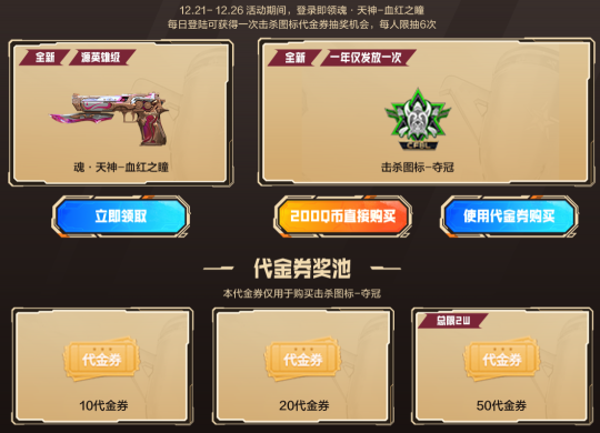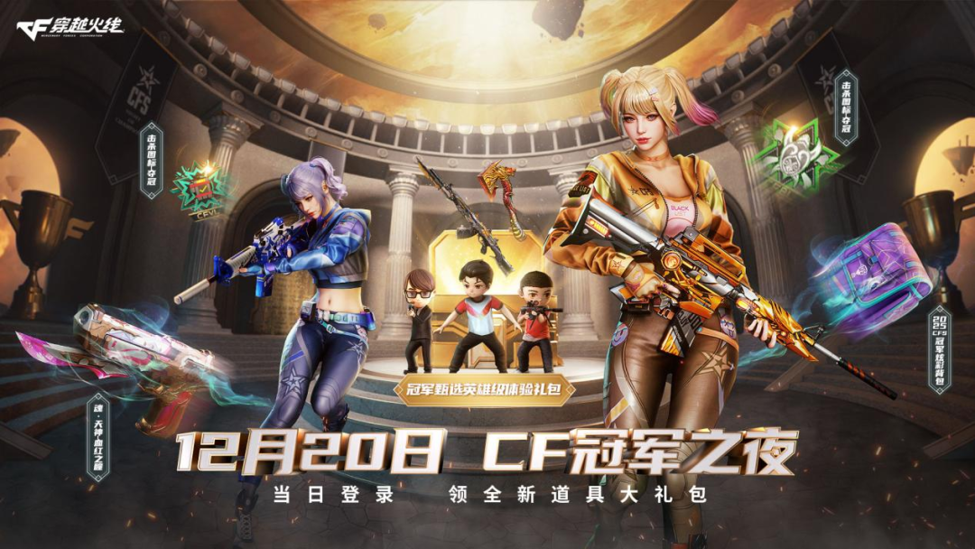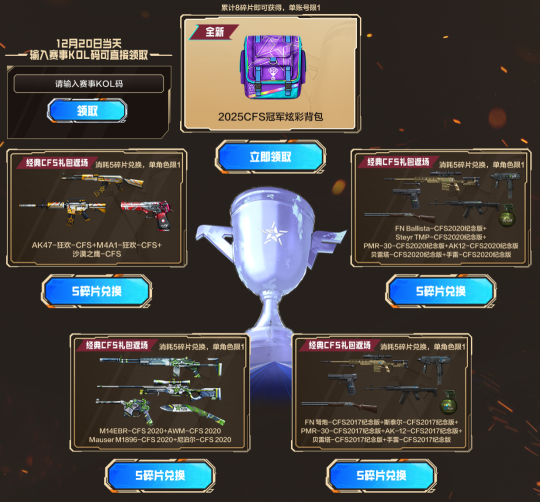 12月20日起,冠军之夜系列福利即将正式上线。限时登录即可领取全新【击杀图标-夺冠】、全新源英雄级武器【魂·天神-血红之瞳】,还能在经典2+1角色【潘多拉-锋芒精英】与【斯沃特-锋芒精英】中二选一;英雄级道具一折购也将在直播间限时开启,更有连续7天的冠军甄选英雄级体验礼包每日可抽!各位CFer,别错过这场荣耀狂欢! 活动时间:12.20-12.26 核心道具奖励:毁灭-孙三炮(7天)、荣耀世冠-龙啸(7天)、麒麟刺(7天)等英雄级武器 参与方法: 1、活动期间,CFer每天可从三个奖池(主武器、副武器、近战武器)中开启一个道具,领取对应的7天英雄级装备; 2、可从已抽出的道具里选一个分享给好友,每人限分享一次; 3、12.20-12.21输入赛事口令并登录后能额外获得一次开启奖池的机会。 活动时间:12.20-12.26 核心道具奖励:击杀图标-夺冠、魂·天神-血红之瞳、潘多拉-锋芒精英/斯沃特-锋芒精英(2选1)、代金券若干(仅限购买击杀图标-夺冠) 参与方法:12月20日当天登录游戏即可直接领取全部奖励,后续也可在12月26日前登录补领魂·天神-血红之瞳,但如果错过当天还想拥有击杀图标-夺冠,则需要选择花费200Q币购买击杀图标-夺冠或每日登录获得1次击杀图标代金券抽奖机会后折扣购买,代金券每人限抽6次。 活动时间:12.20-12.30(12月23日更新后可领取背包) 核心道具奖励:2025CFS冠军炫彩背包 参与方法: 1、12月20日当天输入赛事口令,可直接解锁2025CFS冠军炫彩背包; 2、12.20当日登录得2片碎片,12.21-12.30每日登录得1片碎片; 3、分享背包给1位好友,好友登录后双方各得1片碎片; 4、若错过12月20日当天兑换,集齐8片碎片也可兑换2025CFS冠军炫彩背包,消耗碎片也可兑换其他经典CFS礼包。 12月20日起,还有英雄级道具一折购福利将在直播间开启,各位CFer不要忘记前来解锁冠军之夜,共庆2025CFS冠军时刻哟! |