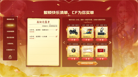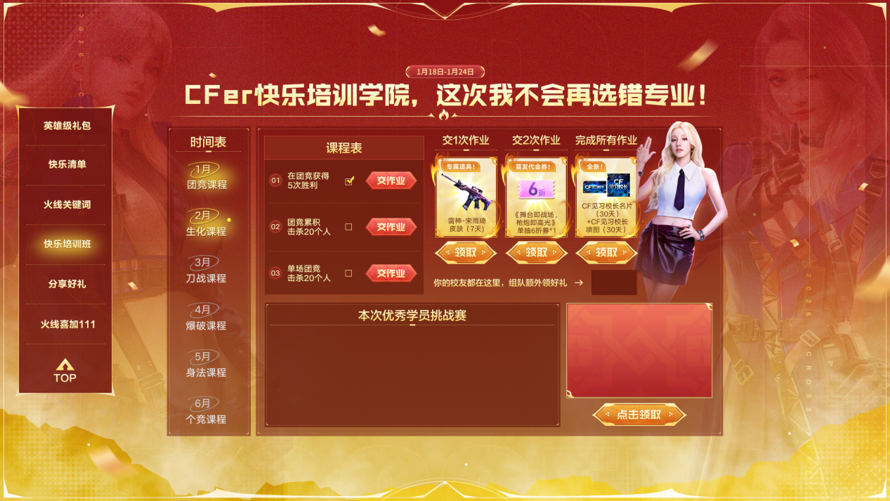 2026年全新活动“火线18号”即将惊喜上线!不仅后续每月18号都将有超值代金券和超人气道具的限时体验机会,1月18日还将有宋雨琦作为本期火线见证官向各位CFer送上更多惊喜内容,活动期间参与游戏还能获得被杀不计+5倍经验的惊喜BUFF,网吧特权也将限时加码,快来一起看看吧! 登录即领,月月体验英雄级 活动时间:1.18-1.24 核心道具奖励:限时英雄级礼包(含主武器、副武器及近战武器) 参与方法:CFer活动期间登录游戏即可领取英雄级奖励。 火线见证官,宋雨琦1月加码献礼 活动时间:1.18 核心道具奖励:宋雨琦角色(7天)+《舞台即战场,枪炮即高光》单抽6折代金券*1 参与方法:CFer活动期间登录游戏即可领取以上全新首发奖励。 火线关键词,CF大事件每月回顾中 活动时间:1.18-1.24 核心道具奖励:M4A1-S+AK47-A+AWM-A+Desert Eagle-A 参与方法:CFer活动期间登录游戏即可领取奖励。 快乐清单,许愿赢18周年成年礼 活动时间:每月18日至24日 核心道具奖励:摩托车、电脑、机酒、CF比赛门票、英雄级等。 参与方法:CFer每月18日至24日登录1次游戏即可进行许愿,8月18周年嘉年华统一开奖,并且许愿次数越多中奖概率越大。 完成任务领福利,快乐培训学院开课啦 活动时间:1.18-1.24 核心道具奖励:雷神-宋雨琦 皮肤(7天)、《舞台即战场,枪炮即高光》6折代金券、CF见习校长名片(30天)+CF见习校长喷图(30天)、CF明星校长名片(30天)+CF明星校长喷图(30天)。 参与方法:培训学院每个月解锁一个课程主题,CFer完成课程上对应任务即可获得奖励,组队还可以额外领取好礼,获得优秀学员挑战赛名次还可获得CF明星校长名片(30天)+CF明星校长喷图(30天)。 除以上玩法外,“火线18号”主题活动还将每月为广大CFer带来登录即领飞行棋骰子*2(暂定)及火麒麟专属英雄计划材料*1的惊喜福利,CFer将活动分享至抖音还可以进行抽奖,1月有机会抽取获得全新匕首-猎影,更有VVIP限时体验机会不容错过。各位CFer敬请期待! |