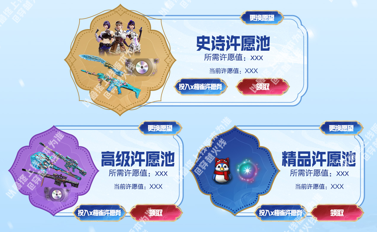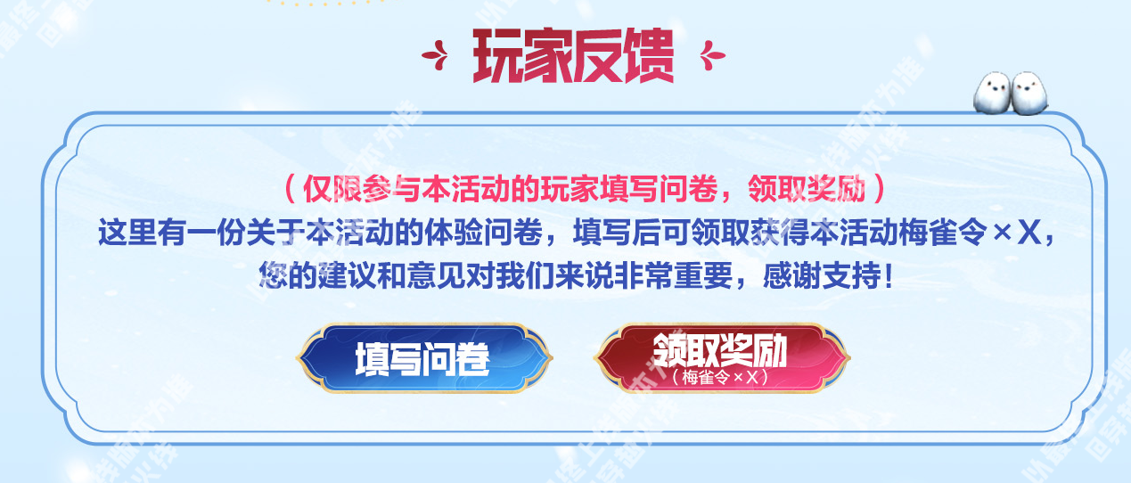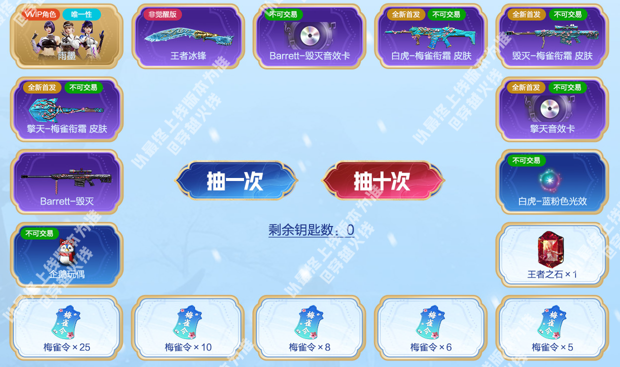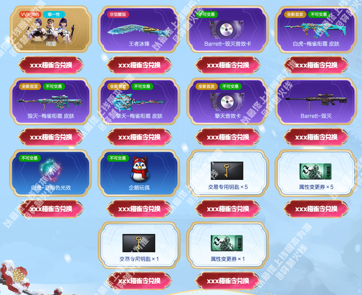 全新白虎-梅雀衔霜、毁灭-梅雀衔霜、擎天-梅雀衔霜系列皮肤即将首发,还有VVIP角色雨墨和非觉醒版王者冰锋返场,CFer们赶快来看看这期活动有哪些猛料吧。 活动奖励 主奖池? 本次夺宝的主奖池不仅首发了白虎-梅雀衔霜 皮肤、毁灭-梅雀衔霜 皮肤、擎天-梅雀衔霜 皮肤、擎天音效卡,还返场了雨墨、非觉醒版王者冰锋、Barrett-毁灭音效卡等稀有道具。 当CFer在奖池中获取到可分解的道具时,可前往暂存箱选择分解为梅雀令或直接发往游戏仓库。 注意:在本活动中任意付费,即可前往超值返利活动中点亮雨墨形象。 梅雀许愿 CFer在购买钥匙时会获得对应数量的梅雀许愿券,在对应许愿池投入指定数量的梅雀许愿券获得的许愿值达到一定数值即可领取一次许愿奖励,获得许愿池内已许愿的一件道具。 注意:若期间更换愿望道具或领取愿望道具,则许愿经验值清零;许愿获得的道具不进暂存箱直接发往游戏内,许愿唯一性道具时记得提前确认仓库持有情况。 活动规则 梅雀令兑换 当CFer们攒够指定数额的梅雀令时,可前往积分兑换专区兑换自己心仪的道具,首发的白虎-梅雀衔霜 皮肤、毁灭-梅雀衔霜 皮肤、擎天-梅雀衔霜 皮肤、擎天音效卡,还有返场的雨墨、非觉醒版王者冰锋、Barrett-毁灭音效卡等全部主奖池道具都可以在这里领取哦~ 玩家反馈 所有参与过本次活动的CFer可在该版块填写一份调查问卷,填写完成后可领取一定数量的梅雀令的奖励。 |