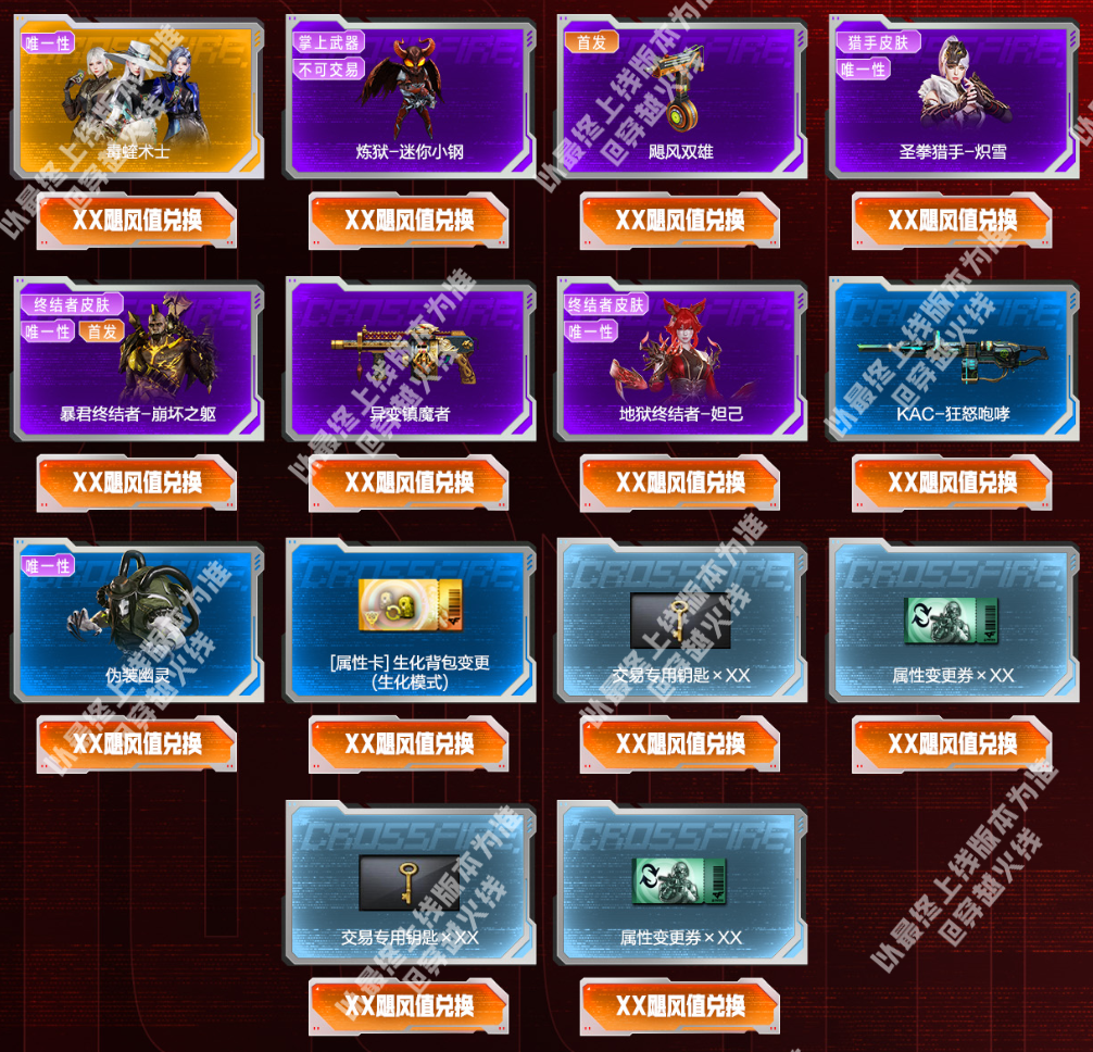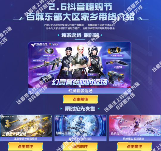 飓风双雄夺宝奖池 在本次的飓风双雄夺宝奖池中,全新生化强化武器 飓风双雄与终结者皮肤 暴君终结者-崩坏之躯即将首发,另外还有生化专精VVIP角色 毒蝰术士、猎手皮肤 圣拳猎手-炽雪、终结者皮肤 地狱终结者-妲己等道具返场。 活动奖励 主奖池 本次夺宝的主奖池不仅首发了飓风双雄与暴君终结者-崩坏之躯,还返场了毒蝰术士、圣拳猎手-炽雪、地狱终结者-妲己、炼狱-迷你小钢、异变镇魔者等稀有道具。 当CFer在奖池中抽到了可分解的道具时,可前往暂存箱选择分解为飓风值或直接发往游戏仓库。 全新的飓风双雄属于MAC-10系列武器,生化模式中前置子弹数更多,还新增了双持模式,在该模式下的前置子弹数将直接翻倍。 而本次返场的毒蝰术士则拥有封印圣符、第六感、能量汲取以及灵魂武者等属性。使用该角色游玩生化模式,造成一定伤害即可获得持续一定时间的增伤效果。此外,还能够在一定范围内感应幽灵位置、识破幽灵伪装,可谓实力与颜值兼备。 生化补给 当CFer在主奖池获取到生化补给箱后,每个补给箱都可在减少停顿道具、夺命利斧、王者之石三款道具中任选其一发放仓库,期限版的减少停顿道具和夺命利斧重复获得后期限会叠加。 活动规则 飓风值兑换区 当CFer攒够指定数额的飓风值时,可前往奖励兑换专区兑换自己心仪的道具,毒蝰术士、炼狱-迷你小钢、飓风双雄、暴君终结者-崩坏之躯、圣拳猎手-炽雪、地狱终结者-妲己、异变镇魔者等道具都可以在这里兑换哦! 本次“抖音嗨购节”不仅为CFer准备了全新王者堕天神套装、全新量子之心套装、全新女团角色虹儿等抢先发售的道具,还限时返场了幻灵套装,跟着一起来看看吧! 量子之心夺宝池 CFer在抖音直播间可以抢先购买《超导无界 量子共鸣》活动复活币礼包,获赠的抽奖钥匙可以抢先在本次的量子之心夺宝奖池使用,全新VVIP角色智、Kar98K-量子之心、Anaconda-量子之心、扳手-量子之心、掌上武器雷神-研、量子之心系列投掷武器、玄武-量子聚变皮肤、HK417-朱雀-量子聚变皮肤、裁决-量子聚变皮肤即将首发。 活动奖励 主奖池 本次夺宝的主奖池首发了智、Kar98K-量子之心、Anaconda-量子之心、扳手-量子之心与雷神-研,并且以上道具获取概率限时提升!同时,量子之心系列投掷武器、玄武-量子聚变皮肤、HK417-朱雀-量子聚变皮肤、裁决-量子聚变皮肤等首发道具也可在主奖池中获取。 当CFer在奖池中抽到了可分解的道具时,可前往暂存箱选择分解为钥匙或直接发往游戏仓库。 量子之心礼包 2月6日CFer可在抖音官方直播间限量购买7套量子之心礼包,也可在页面购买开放后,前往活动页面限量购买7套量子之心礼包。量子之心礼包包含量子之心系列投掷武器、量子之心礼盒以及王者之石×10。 此外累计购买一定数量的礼包还可领取对应奖励,例如购买7套礼包即可直接领取Kar98K-量子之心。 第一轮7套累购奖励全部领取后会自动刷新并开启第二轮,CFer可再次领取累购奖励,总共可领2轮。 注:抖音与活动页面购买次数将一同计算,如抖音购买3套,活动页面购买3套,则按6套计算。若想领取两轮累购奖励则需要在抖音购买7套,活动页面购买7套,总计14套量子之心礼包。2月6日当天直播结束后,量子之心礼包直播间购买入口将关闭。 活动规则 积分兑换区 当CFer攒够指定数额的积分时,可前往奖励兑换专区兑换自己心仪的道具,智、Kar98K-量子之心、Anaconda-量子之心、扳手-量子之心、量子之心系列投掷武器、雷神-研、玄武-量子聚变皮肤、HK417-朱雀-量子聚变皮肤、裁决-量子聚变皮肤、英雄级/高级/普通角色通用扩展栏位券等道具都可以在这里兑换哦! 18周年春节套装回归限定福利 CFer仓库持有并在页面点亮?智、Kar98K-量子之心、Anaconda-量子之心、扳手-量子之心、量子之心系列投掷武器、雷神-研共计8个道具图案即可获得套装副武器自选礼盒、雷神-赛博幻想/首发麒麟刺-流金琥珀武器二选一资格以及道聚城通用代金券×100,单账号限1。 CFer 获取套装副武器自选礼盒后,可从展示图中所列的10款道具里自由选择,涵盖了COP 357-雷霆、USP-雷暴、COP-堕天神、Anaconda-玄豹等稀有道具。 注:本活动不会统计CFer私人金库内的道具存储情况,如果道具在私人金库中需要取出道具再领取福利。 超导问答 CFer还可在本版块参与超导问答活动,每答对1题就可获得一定数额的积分奖励,每道题每天可回答1次,活动期间单账户可获得的积分有一定上限。 虹儿夺宝奖池 在本次的虹儿夺宝奖池中,全新女团角色虹儿领衔女团主题近战武器心动卡牌-Heartshot与雨墨玩偶首发,另外还有M14EBR-玄武、火麒麟-Heartshot皮肤、金色蔷薇-破浪逐光皮肤、幻影-破浪逐光皮肤和屠龙浪逐光皮肤等道具返场。 活动奖励 主奖池 本次夺宝的主奖池不仅首发了虹儿、心动卡牌-Heartshot与雨墨玩偶,还返场了M14EBR-玄武、M14EBR-玄武音效卡、火麒麟-Heartshot皮肤、金色蔷薇-破浪逐光皮肤、幻影-破浪逐光皮肤、屠龙-破浪逐光皮肤等稀有道具。 当CFer在奖池中抽到了可分解的道具时,可前往暂存箱选择分解为抽奖钥匙或直接发往游戏仓库。主奖池奖励道具同时可以在活动页的兑换板块,使用心动币进行兑换哦~ 虹运连连 CFer还可在本版块花费一定数量的Q币开卡,达到指定等级即可领取对应的抽奖钥匙、火麒麟-瀚海蓝晶武器以及英雄级通用角色普通栏位