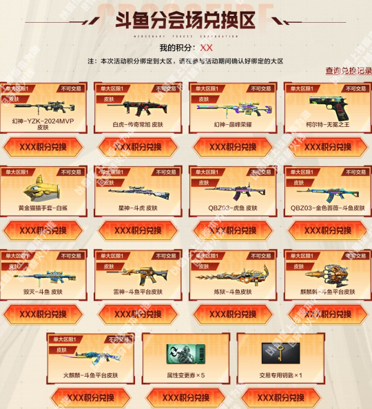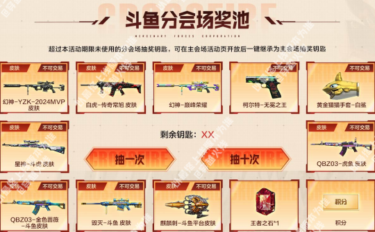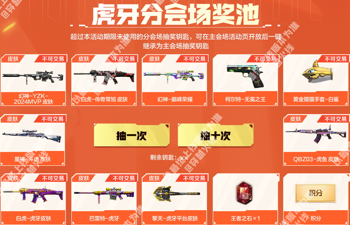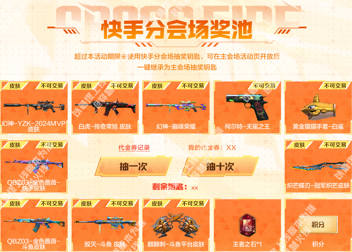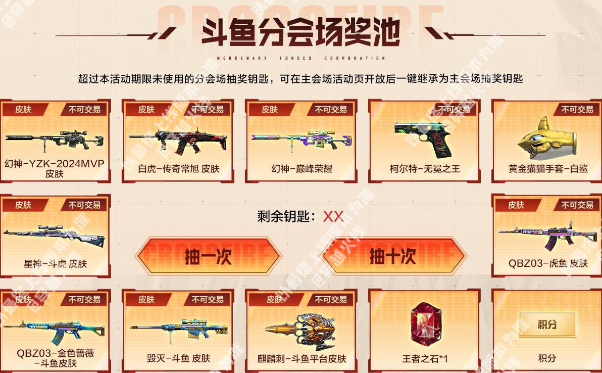 全新赛事主题的幻神-YZK-2024MVP皮肤以及白虎-传奇常旭皮肤即将在本期活动迎来首发。幻神-YZK-2024MVP皮肤以深邃的哑光黑为基底,点缀亮银线条,塑造出冷峻强势的独特气质,作为2024年度MVP的专属皮肤,极具纪念意义;白虎-传奇常旭皮肤则以黑红撞色为主,枪身笼罩着黑色闪电光效,视觉冲击力拉满。 同时幻神-巅峰荣耀、柯尔特-无冕之王等稀有的赛事主题皮肤和道具也将在本次活动中返场,并且三大分会场皆有专属奖池道具和购买奖励,一起来看看吧。 斗鱼分会场介绍 斗鱼特惠礼包 活动期间将限时发售特惠礼包,CFer们在活动页面购买不同数量的【冠军时刻】和【穿越火线】即可获赠指定数额的抽奖钥匙,抽奖钥匙可用于下方主奖池的抽奖。(本期礼包总量有限,本会场热力值消耗完将无法购买) 斗鱼分会场奖池 斗鱼分会场奖池,除了幻神-YZK-2024MVP皮肤、白虎-传奇常旭皮肤、幻神-巅峰荣耀、柯尔特-无冕之王和黄金猫猫手套-白鲨外,还额外加入了星神-斗虎皮肤、QBZ03-虎鱼皮肤、QBZ03-金色蔷薇-斗鱼皮肤、毁灭-斗鱼皮肤和麒麟刺-斗鱼平台皮肤等道具。 当CFer在奖池中获取到可分解的道具时,可前往暂存箱选择分解为钥匙或直接发往游戏仓库。 注:超过本活动期限未使用的分会场抽奖钥匙,可在主会场活动页开放后一键继承为主会场抽奖钥匙。 斗鱼分会场积分兑换 当CFer们攒够指定数额积分时,可前往积分兑换专区兑换自己心仪的道具,幻神-YZK-2024MVP皮肤、星神-斗虎皮肤、QBZ03-金色蔷薇-斗鱼皮肤、毁灭-斗鱼皮肤和麒麟刺-斗鱼平台皮肤等奖池中的道具以及雷神-斗鱼平台皮肤、火麒麟-斗鱼平台皮肤等道具都可以在这里兑换。 虎牙分会场介绍 虎牙特惠礼包 活动期间将限时发售特惠礼包,CFer们在活动页面购买不同数量的【喜爱福】即可获赠指定数额的抽奖钥匙,抽奖钥匙可用于下方主奖池的抽奖。(本期礼包总量有限,本会场热力值消耗完将无法购买) 虎牙分会场奖池 虎牙分会场奖池,除了幻神-YZK-2024MVP皮肤、白虎-传奇常旭皮肤、幻神-巅峰荣耀、柯尔特-无冕之王和黄金猫猫手套-白鲨外,还额外加入了星神-斗虎皮肤、QBZ03-虎鱼皮肤、白虎-虎牙皮肤、巴雷特-虎牙和擎天-虎牙平台皮肤等道具。 当CFer在奖池中获取到可分解的道具时,可前往暂存箱选择分解为钥匙或直接发往游戏仓库。 注:超过本活动期限未使用的分会场抽奖钥匙,可在主会场活动页开放后一键继承为主会场抽奖钥匙。 虎牙分会场积分兑换 当CFer们攒够指定数额积分时,可前往积分兑换专区兑换自己心仪的道具,幻神-YZK-2024MVP皮肤、星神-斗虎皮肤、白虎-虎牙皮肤、巴雷特-虎牙和擎天-虎牙平台皮肤等奖池中的道具以及雷神-虎牙平台皮肤、火麒麟-虎牙平台皮肤等道具都可以在这里兑换。 快手分会场介绍 快手特惠礼包 活动期间将限时发售特惠礼包,CFer们在活动页面购买不同数量的【CF福星】和【CF福宝】即可获赠指定数额的抽奖钥匙,抽奖钥匙可用于下方主奖池的抽奖。(本期礼包总量有限,本会场热力值消耗完将无法购买) 快手分会场奖池 快手分会场奖池,除了幻神-YZK-2024MVP皮肤、白虎-传奇常旭皮肤、幻神-巅峰荣耀、柯尔特-无冕之王和黄金猫猫手套-白鲨外,还额外加入了QBZ03-金色蔷薇-快手皮肤、炽芒蝶刃-冠军炽芒皮肤、QBZ03-金色蔷薇-斗鱼皮肤、毁灭-斗鱼皮肤和麒麟刺-斗鱼平台皮肤等道具。 当CFer在奖池中获取到可分解的道具时,可前往暂存箱选择分解为钥匙或直接发往游戏仓库。 注:超过本活动期限未使用的分会场抽奖钥匙,可在主会场活动页开放后一键继承为主会场抽奖钥匙。 快手分会场积分兑换 当CFer们攒够指定数额积分时,可前往积分兑换专区兑换自己心仪的道具,幻神-YZK-2024MVP皮肤、QBZ03-金色蔷薇-快手皮肤、炽芒蝶刃-冠军炽芒皮肤、QBZ03-金色蔷薇-斗鱼皮肤和麒麟刺-斗鱼平台皮肤等奖池中道具都可以在这里兑换。 |