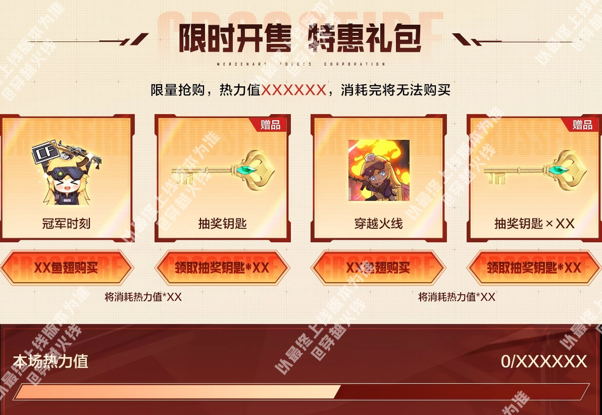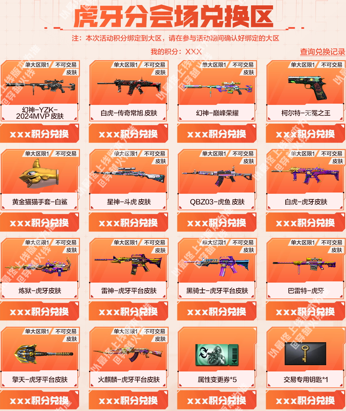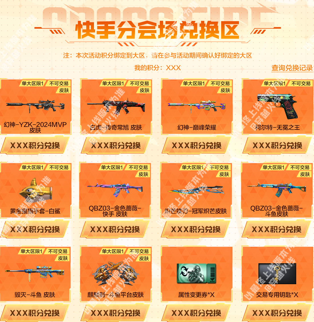 全新赛事主题的幻神-YZK-2024MVP皮肤以及白虎-传奇常旭皮肤即将在本期活动迎来首发。幻神-YZK-2024MVP皮肤以深邃的哑光黑为基底,点缀亮银线条,塑造出冷峻强势的独特气质,作为2024年度MVP的专属皮肤,极具纪念意义;白虎-传奇常旭皮肤则以黑红撞色为主,枪身笼罩着黑色闪电光效,视觉冲击力拉满。 同时幻神-巅峰荣耀、柯尔特-无冕之王等稀有的赛事主题皮肤和道具也将在本次活动中返场,并且三大分会场皆有专属奖池道具和购买奖励,一起来看看吧。 斗鱼分会场介绍 斗鱼特惠礼包 活动期间将限时发售特惠礼包,CFer们在活动页面购买不同数量的【冠军时刻】和【穿越火线】即可获赠指定数额的抽奖钥匙,抽奖钥匙可用于下方主奖池的抽奖。(本期礼包总量有限,本会场热力值消耗完将无法购买) 斗鱼分会场奖池 斗鱼分会场奖池,除了幻神-YZK-2024MVP皮肤、白虎-传奇常旭皮肤、幻神-巅峰荣耀、柯尔特-无冕之王和黄金猫猫手套-白鲨外,还额外加入了星神-斗虎皮肤、QBZ03-虎鱼皮肤、QBZ03-金色蔷薇-斗鱼皮肤、毁灭-斗鱼皮肤和麒麟刺-斗鱼平台皮肤等道具。 当CFer在奖池中获取到可分解的道具时,可前往暂存箱选择分解为钥匙或直接发往游戏仓库。 注:超过本活动期限未使用的分会场抽奖钥匙,可在主会场活动页开放后一键继承为主会场抽奖钥匙。 斗鱼分会场积分兑换 当CFer们攒够指定数额积分时,可前往积分兑换专区兑换自己心仪的道具,幻神-YZK-2024MVP皮肤、星神-斗虎皮肤、QBZ03-金色蔷薇-斗鱼皮肤、毁灭-斗鱼皮肤和麒麟刺-斗鱼平台皮肤等奖池中的道具以及雷神-斗鱼平台皮肤、火麒麟-斗鱼平台皮肤等道具都可以在这里兑换。 虎牙分会场介绍 虎牙特惠礼包 活动期间将限时发售特惠礼包,CFer们在活动页面购买不同数量的【喜爱福】即可获赠指定数额的抽奖钥匙,抽奖钥匙可用于下方主奖池的抽奖。(本期礼包总量有限,本会场热力值消耗完将无法购买) 虎牙分会场奖池 虎牙分会场奖池,除了幻神-YZK-2024MVP皮肤、白虎-传奇常旭皮肤、幻神-巅峰荣耀、柯尔特-无冕之王和黄金猫猫手套-白鲨外,还额外加入了星神-斗虎皮肤、QBZ03-虎鱼皮肤、白虎-虎牙皮肤、巴雷特-虎牙和擎天-虎牙平台皮肤等道具。 当CFer在奖池中获取到可分解的道具时,可前往暂存箱选择分解为钥匙或直接发往游戏仓库。 注:超过本活动期限未使用的分会场抽奖钥匙,可在主会场活动页开放后一键继承为主会场抽奖钥匙。 虎牙分会场积分兑换 当CFer们攒够指定数额积分时,可前往积分兑换专区兑换自己心仪的道具,幻神-YZK-2024MVP皮肤、星神-斗虎皮肤、白虎-虎牙皮肤、巴雷特-虎牙和擎天-虎牙平台皮肤等奖池中的道具以及雷神-虎牙平台皮肤、火麒麟-虎牙平台皮肤等道具都可以在这里兑换。 快手分会场介绍 快手特惠礼包 活动期间将限时发售特惠礼包,CFer们在活动页面购买不同数量的【CF福星】和【CF福宝】即可获赠指定数额的抽奖钥匙,抽奖钥匙可用于下方主奖池的抽奖。(本期礼包总量有限,本会场热力值消耗完将无法购买) 快手分会场奖池 快手分会场奖池,除了幻神-YZK-2024MVP皮肤、白虎-传奇常旭皮肤、幻神-巅峰荣耀、柯尔特-无冕之王和黄金猫猫手套-白鲨外,还额外加入了QBZ03-金色蔷薇-快手皮肤、炽芒蝶刃-冠军炽芒皮肤、QBZ03-金色蔷薇-斗鱼皮肤、毁灭-斗鱼皮肤和麒麟刺-斗鱼平台皮肤等道具。 当CFer在奖池中获取到可分解的道具时,可前往暂存箱选择分解为钥匙或直接发往游戏仓库。 注:超过本活动期限未使用的分会场抽奖钥匙,可在主会场活动页开放后一键继承为主会场抽奖钥匙。 快手分会场积分兑换 当CFer们攒够指定数额积分时,可前往积分兑换专区兑换自己心仪的道具,幻神-YZK-2024MVP皮肤、QBZ03-金色蔷薇-快手皮肤、炽芒蝶刃-冠军炽芒皮肤、QBZ03-金色蔷薇-斗鱼皮肤和麒麟刺-斗鱼平台皮肤等奖池中道具都可以在这里兑换。 |