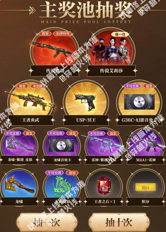 全新无序列号版传说浩劫、王者炎武以及G36C-幻影音效卡即将首发,还有CFer们期待已久的传说艾莉莎也将在本次夺宝返场。 作为QBZ-03枪系的新传说武器,传说浩劫不仅有着质感十足黑红配色,枪身上的骨刺造型与火焰特效更是将视觉冲击力拉满。在挑战模式中,不仅拥有强力的地狱审判技能,还可为团队带来十分可观的增益效果。 传说艾莉莎外观精致冷艳,保卫、潜伏、灵魂武者三种形态各具魅力,充满时尚感。更是拥有专属C4造型,十分酷炫。传说艾莉莎按E可发动猛击进行强力的近距离攻击,打击感极强,挑战模式中,还拥有狂暴弹等强力技能,颜值与强度兼备。 本次夺宝的主奖池不仅首发了无序列号版传说浩劫、未觉醒版王者炎武、G36C-幻影音效卡、龙啸音效卡、龙啸-紫凛皮肤、雷神-紫凛皮肤和玄武投影,还返场了传说艾莉莎和USP-冥王等稀有道具。 当CFer在奖池中获取到可分解的道具时,可前往暂存箱选择分解为钥匙或直接发往游戏仓库。 当CFer攒够指定数额的积分时,可前往兑换区兑换自己心仪的道具,主奖池中的无序列号版传说浩劫、传说艾莉莎、USP-冥王、未觉醒版王者炎武、G36C-幻影音效卡、龙啸音效卡、龙啸-紫凛皮肤、雷神-紫凛皮肤、玄武投影、M4A1-雷神以及龙啸等道具都可以在这里兑换哦! 所有参与过本次活动的CFer可在该板块填写一份调查问卷,填写完成后可领取一定数量的积分奖励。 |
