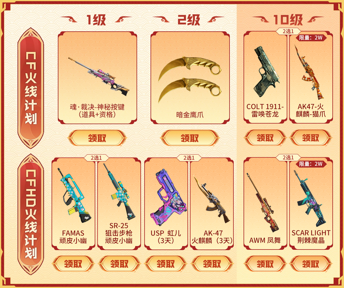 3月1日至3月31日,《穿越火线》联合快手游戏的“3月火线计划”正式上线!双端限定武器、等级解锁好礼同步派送,完成简单任务即可升级领福利,回归玩家更享额外经验加成,CFer 们速来解锁专属春日作战装备! 等级解锁限定福利双端好礼随心抱走 活动期间,CFer提升火线计划等级至对应阶段,就能解锁CF与CFHD双端专属奖励,从实用武器到限定道具,福利层层加码,等级提升过程中均有好礼相赠,达到10级更有机会抱走限定武器AK47-火麒麟-猫爪或COLT1911-雷唤苍龙。 多渠道赚经验 回归玩家升级加速 CFer完成任务即可快速积累经验,轻松提升火线计划等级。点赞、评论、发布?#CF 步枪荣耀话题及#CFHD 前猎突围话题下的视频均可获得经验,参与游戏完成任务、累计登录天数、登录掌火APP或关注指定账号也可获得经验提升,2月28日前未登录过的回归玩家,每天还可额外领取20经验,升级效率直接翻倍! 独家礼包码兑换 100%中奖加码福利 活动页面同步发放CF与CFHD快手独家礼包码,复制对应礼包码前往CF官网兑换专区,即可参与随机抽奖,100%中奖,解锁加码福利!兑换方式超简单,登录对应官网,找到兑换入口输入礼包码,奖品直接发放至游戏仓库。 3 月火线计划福利双端全覆盖,任务简单易完成,奖励丰厚无套路!“灯火元宵夜”惊喜福利活动现已上线。上快手,关注穿越火线官方账号,解锁活动最新玩法,还有更多隐藏好礼等你发现! |
