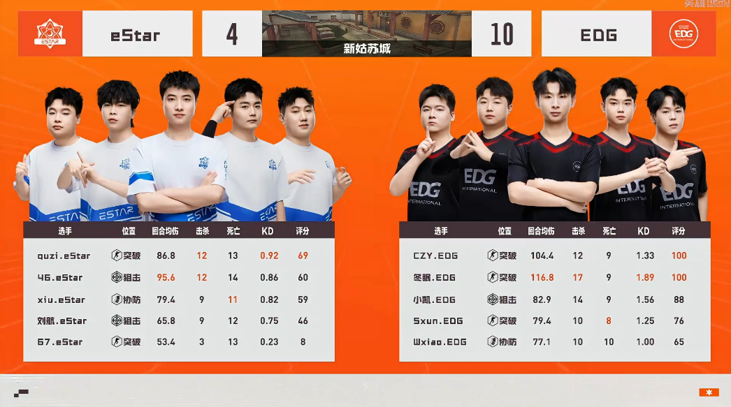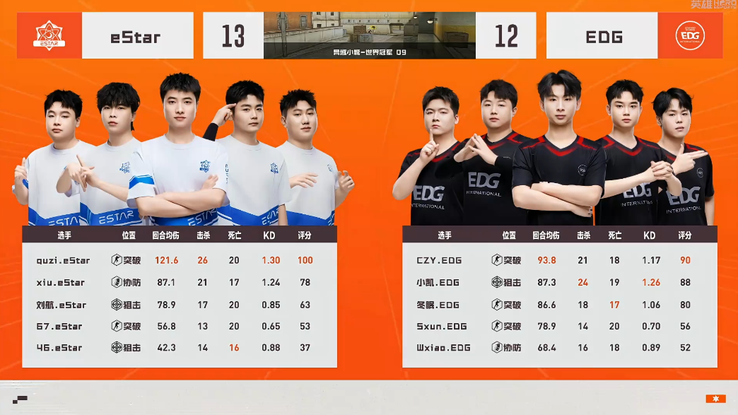 1月20日,CFPL S27常规赛第二周拉开战幕。第二场比赛,eStar则凭借刘航在决胜局的出色发挥,历经苦战以2-1险胜EDG。接下来,让我们一起回顾这场精彩赛事! 第一局异域小城-世界冠军Q9,小凯中路排点狙击双杀,EDG夹击B区先得一分。刘航1V2残局精彩取胜,eStar半场仅以4-5落后。换边后,eStar对A区的进攻连续失误,CZY回防双杀,小凯空降狙击再拿残局,EDG一度占优。eStar及时调整,针对B区进攻连追多个局点,将比分扳至9-9平,比赛进入加时。 加时赛中双方战至黄金加时,eStar在4V5劣势下果断反绕A连接,反清中路得分,最终以13-12险胜第一局,总比分1-0领先。本局MVP归属于quzi。 第二局新姑苏城,冬眠在泥巴路防守双杀开局,小凯与CZY在A仓协同刷屏,EDG开局便建立5-0的优势。46狙击双杀还以颜色,刘航突破B包点得手,但67残局枪法失误,EDG半场以7-2领先。换边后,eStar赌防A区连续追分,EDG则通过反清泥巴路突破B区锁定胜局,最终以10-4赢下第二局,总比分扳为1-1平。本局MVP由冬眠获得。 决胜局港口-CFS,CYZ突破B包点连续刷屏,刘航狙击左右开弓完成单局四杀,双方比分交替上升。67在B包点防守出现失误,刘航回防再送三杀,eStar半场在保卫方以5-4领先。换边后,小凯A包点狙击空枪,67手感回暖突破双杀,eStar凭借一波流进攻取得9-6的赛点。46盲穿带走CZY,刘航丝血残局击倒Wxiao,eStar最终以10-6赢得决胜局,总比分2-1战胜EDG。刘航凭借决胜局23杀的统治级表现,当之无愧获得本局MVP。 【明日赛程预告】 今晚19点整,CFPL S27常规赛将继续进行,对阵分别为:KZ对阵成都AG、XROCK对阵TLG。敬请期待这两场精彩对决! |