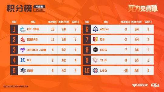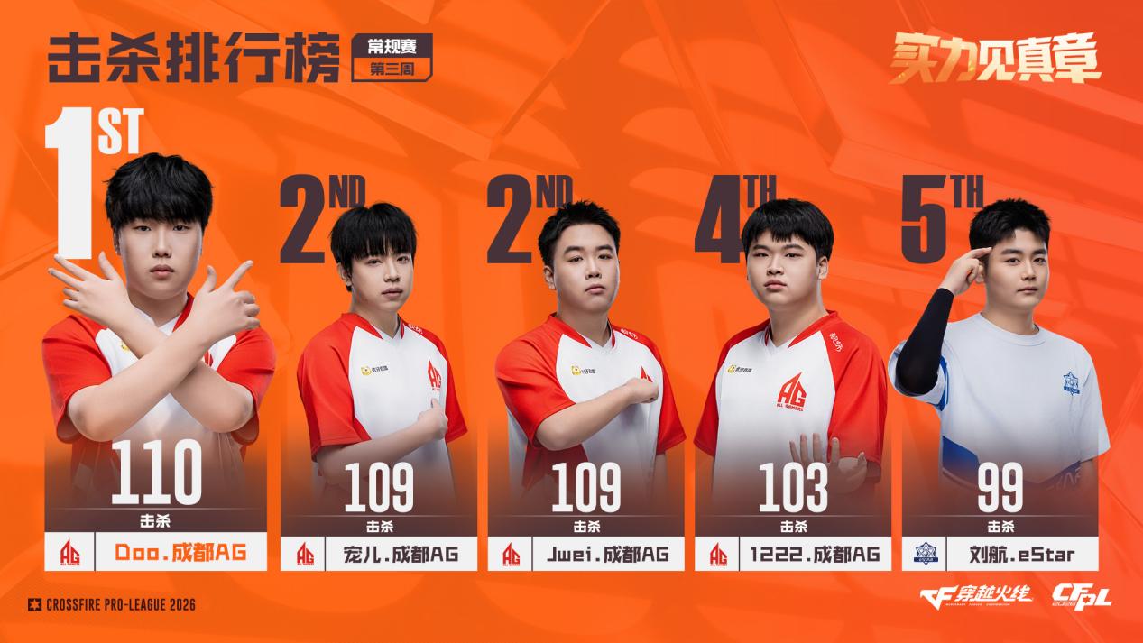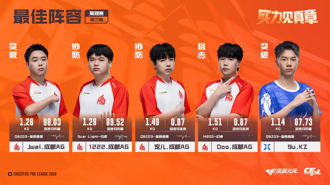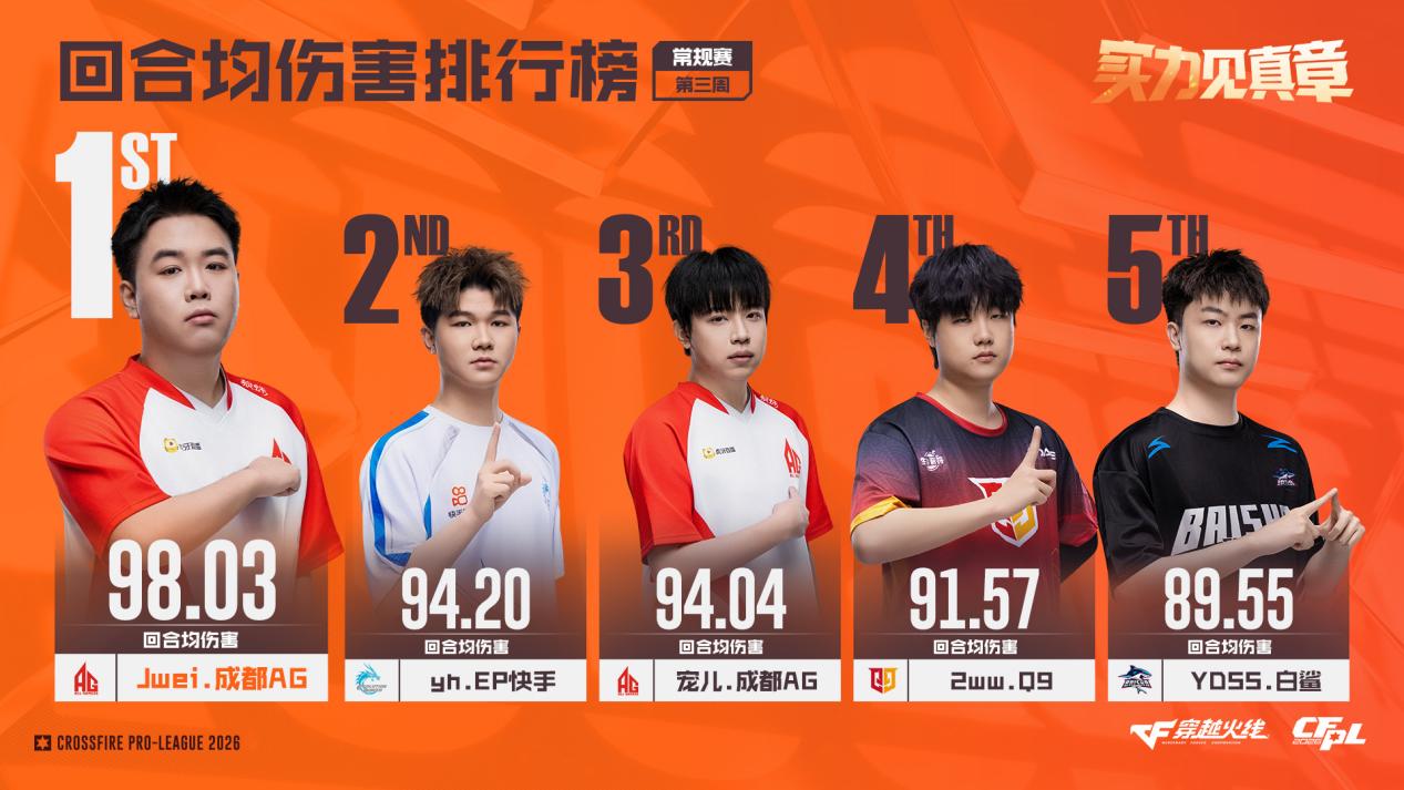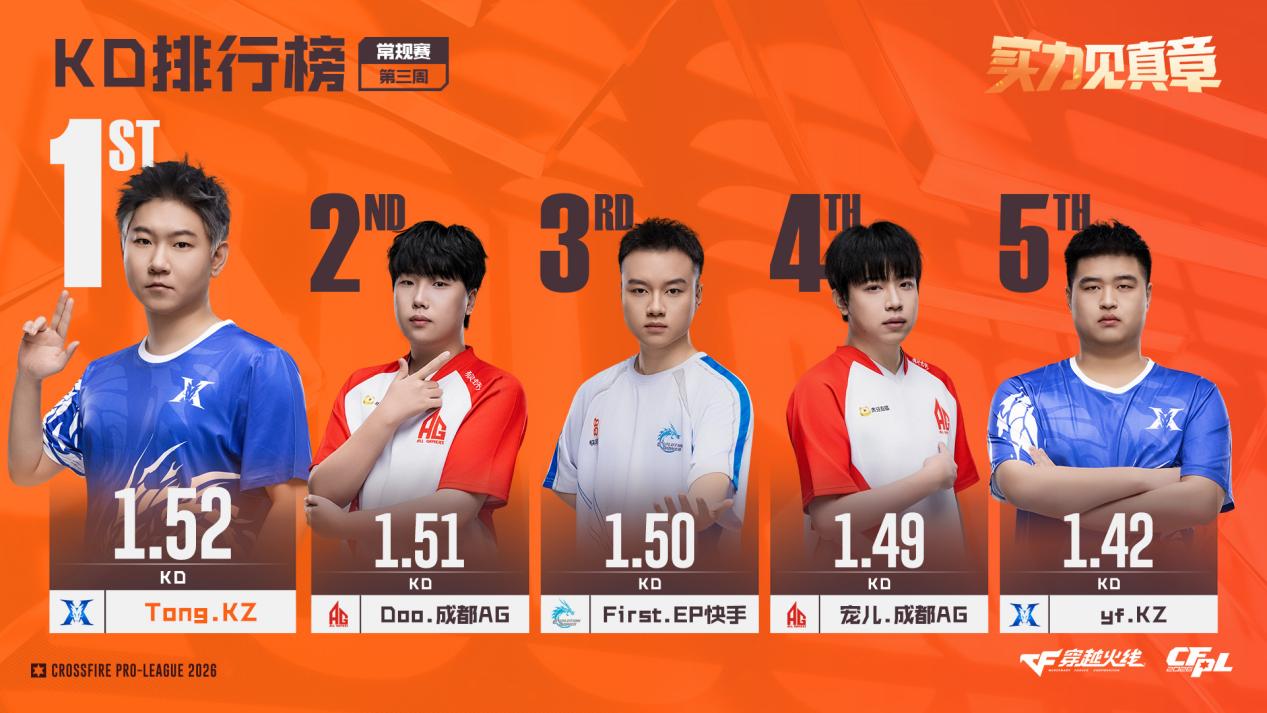 CFPL S27常规赛第三周的比赛已圆满落幕。下面,让我们通过几组关键数据,一同回顾并分析上周各战队与选手的精彩表现! 【积分榜上演“AE”争霸,Jwei获评最佳选手】 经过三周激烈角逐,积分榜形势逐渐明朗。第一集团的EP.快手与成都AG表现强势,双双保持连续7场不败,整体实力与竞技状态明显优于其他队伍。目前,两队已领先第三名XROCK.斗鱼3个胜场,常规赛冠军极有可能在这两支劲旅之间产生。 上周的最佳选手荣誉归属于成都AG的突破手Jwei。Jwei在上周状态火热,以98.03的回合均伤害领跑全联盟。在对阵EDG的后两局比赛中,他更是打出37-9的惊艳数据,帮助队伍实现逆转,获评最佳选手实至名归。Jwei也与1222、宠儿、Doo以及9u共同入选上周最佳阵容。 【狙击手占据KD榜前列,强援2ww输出亮眼】 在象征比赛效率的KD榜上,狙击手表现突出。除宠儿外,前五名选手均以狙击枪为主武器。其中,KZ的双狙击组合Tong与yf的KD值均超过1.4,双核驱动助力KZ取得连胜,成功重返四强行列。 回合均伤害榜则由步枪手主导。值得一提的是,Q9本赛季新引进的选手2ww表现抢眼,上周打出了91.57的超高回合均伤害,其补枪迅速、效率惊人。然而,队伍近期遭遇两连败,若想后来居上,双狙击体系仍需进一步发挥威力。 【成都AG多人上榜击杀榜,LGD新人突破显潜力】 成都AG本赛季状态有所起伏,上周虽取得三连胜,但其中两场为2-1险胜,过程可谓惊心动魄。这也使得队中四名选手Doo、宠儿、Jwei、1222全部跻身击杀榜,且总击杀均突破100,各自均有高光时刻。 另一方面,积分榜暂处下游的LGD也传来佳讯。在回合首杀率榜单中,Tong以19.18%的数据位居榜首。前五名选手中仅有两位步枪手,其中之一便是LGD新上场的青训选手Bzc。Bzc上周打出了16.9%的回合首杀率,突破效率令人瞩目,也让广大CFer对LGD后续的表现增添了几分期待。 以上即为CFPL S27常规赛第三周的数据盘点。随着常规赛逐步推进,各战队选手的竞技状态渐入佳境。常规赛第四周的比赛将于2月3日正式打响,选手们又将带来怎样的精彩对决?让我们一同持续关注! |
