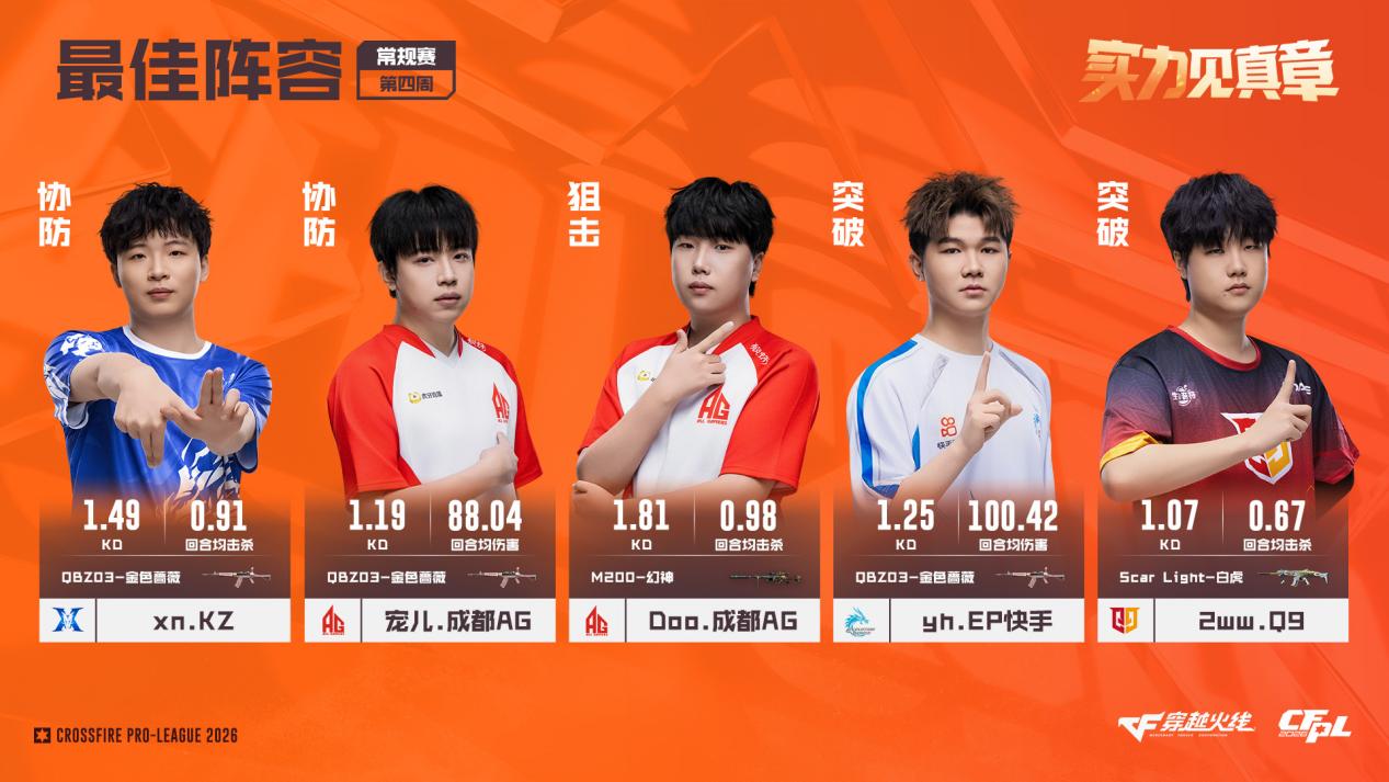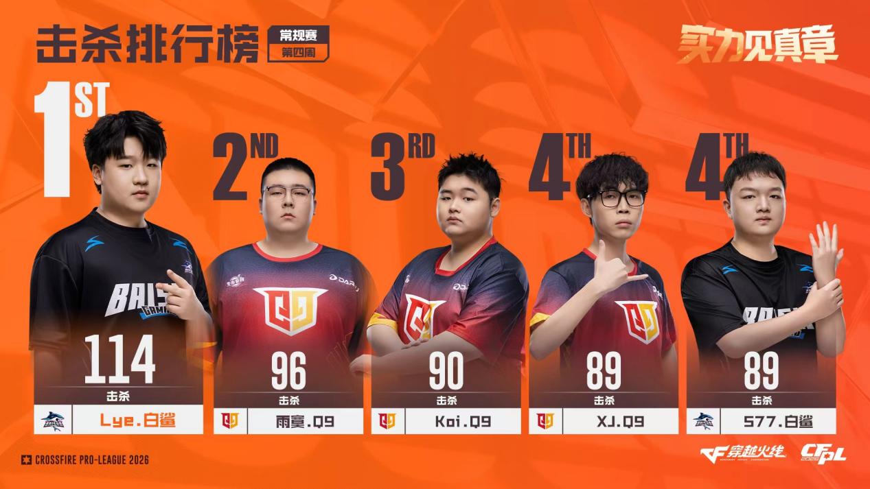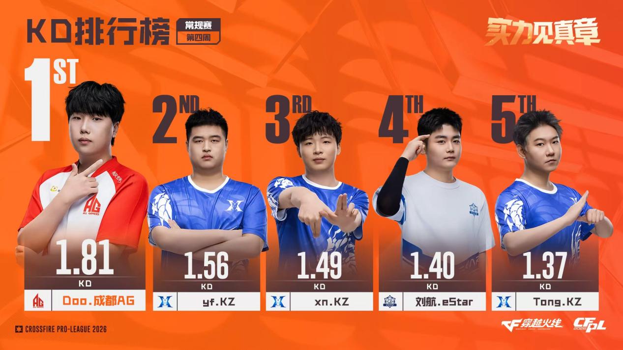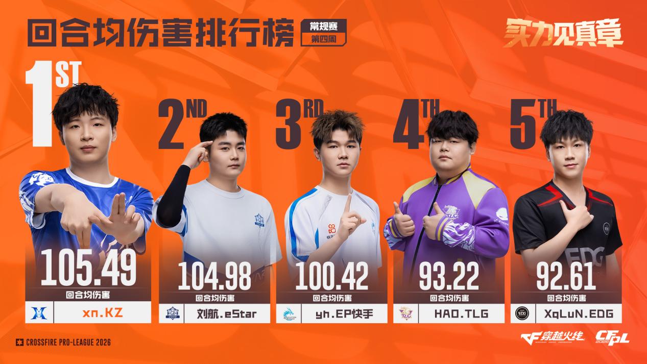 CFPL S27常规赛第四周的比赛正式结束。接下来,我们通过几组数据,共同回顾选手们在上周的精彩表现! 【xn获评最佳选手,残局双子星领衔最佳阵容】 KZ战队在上周保持全胜,并以一波6连胜冲至积分榜第3位,核心指挥xn功不可没。xn在上周的比赛中打出了105.49的联盟最高回合均伤害,1.49的KD值也高居联盟所有选手第三位。其比赛打法少年老成,指挥与输出兼顾,在比赛中能帮助队伍快速实现临场应变,协防与刷屏能力同样出色,获评周最佳选手可谓实至名归。 最佳阵容方面,除最佳选手xn外,最亮眼的当属成都AG的“新残局双子星”——宠儿与Doo。前者持续稳定输出,打出88.04的回合均伤害;后者则在残局中大杀四方,1V3、1V4残局屡屡轻松拿下,KD值高达1.81。这三名选手与同样表现可圈可点的2ww、Lye一同组成了上周的最佳阵容。 【KZ双狙延续火热状态,孤胆英雄输出拉满】 KD排行榜成为狙击手的天下,其中KZ双狙yf与Tong表现尤为亮眼。这两名选手本赛季状态火爆,第三周就曾跻身KD榜前五,第四周再度榜上有名,KD值均突破1.3。比赛中他们屡献首杀,残局得分效率也极高,是KZ连胜的重要保障。 回合均伤害榜单则涌现出多位“孤胆英雄”。eStar核心刘航不仅打出104.98的超高回合均伤害,KD值也达到1.4,成为本赛季队伍中冉冉升起的新星。可惜队友状态平平,刘航未能率领队伍取得连胜。 与刘航处境相似的还有TLG指挥HAO与EDG老将XqLuN。前者状态明显回升,但未能帮助队伍终结连败;后者在卸下指挥重任后输出显著提升,上周助队伍力克Q9,后续表现值得期待。 【白鲨小将断层领跑击杀榜,TLG新人闪亮登场】 击杀排行榜前五名由白鲨与Q9两支队伍包揽。两队在上周均历经多场苦战,胜负各半。白鲨小将Lye双修能力出众,以114次击杀断层领跑总击杀榜;Q9三将雨寞、Koi、XJ的击杀数均接近90,但队伍若想取得更好成绩,还需双突破选手发挥更佳。 回合首杀率排行榜上,位居榜首的是刚完成CFPL生涯首秀的TLG新人LZJ。他在上周的短暂亮相中打出20.83%的首杀率,位列联盟第一。LZJ在赛场上敢打敢拼,虽未能为队伍带来胜利,但个人表现可圈可点,稍加锤炼,未来必将成为TLG阵中的重要力量。 以上即为CFPL S27常规赛第四周比赛的选手数据回顾。接下来联赛将进入短暂休赛期,期待各队选手积极调整,在后续比赛中交出更出色的数据表现!? |