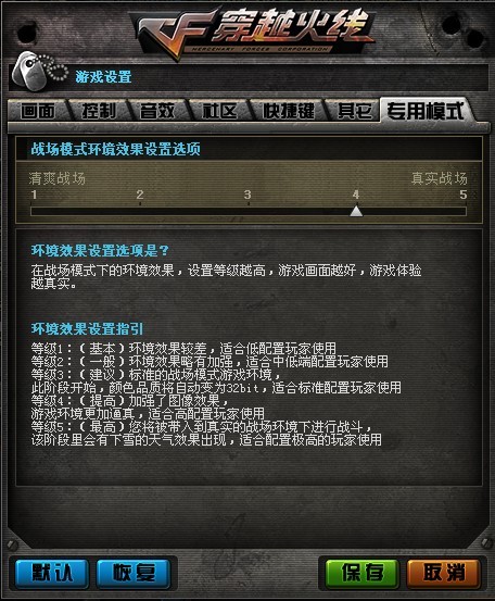 1.为什么传说中的战场模式画质提升没看出来呢?战场模式的画质是需要单独调整的,在设置界面的最后一项“专用模式”中可以调整战场模式的画面等级,战场模式的画面等级共有5级,玩家可以根据电脑和个人喜好自行选择。